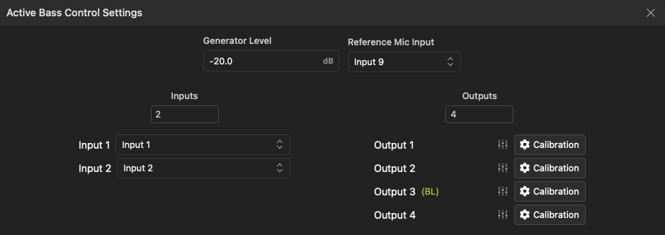 - Inputs: Select the number of input channels the bass control module will process. This could be a single input (if a mono subwoofer feed is used) or more if compensating for multiple PA feeds. Select the associated input channels in the drop-down lists below. Note the inputs must already be routed to the appropriate output channels and the system should be "tuned" before calibration. Any additional changes to the system equalization, relative level or timing will require recalibration.
