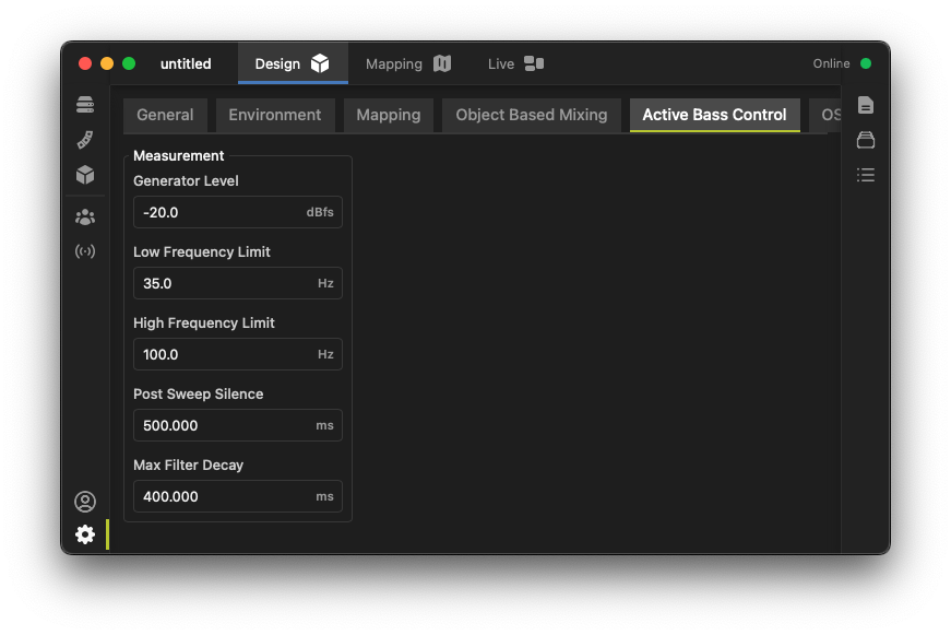 - Max Filter Decay: This is the maximum decay time of the FIR filters used in the active bass control system in milliseconds. Higher values can be used for rooms with longer low-frequency reverberation times.