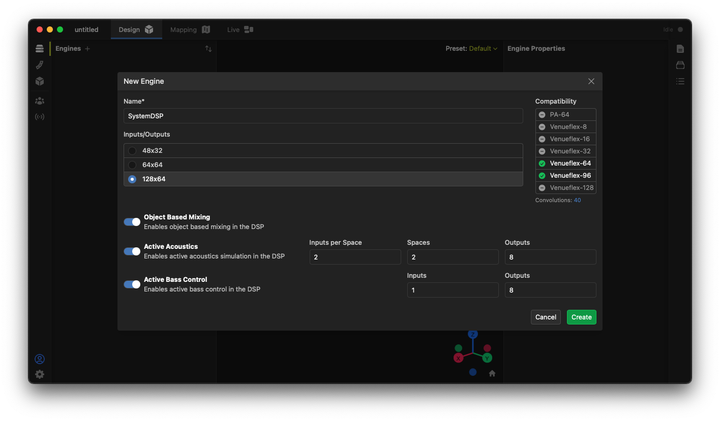 The dialog box allows you to name the new engine and select the features needed for the design. Currently, you may include any of the following functionality: