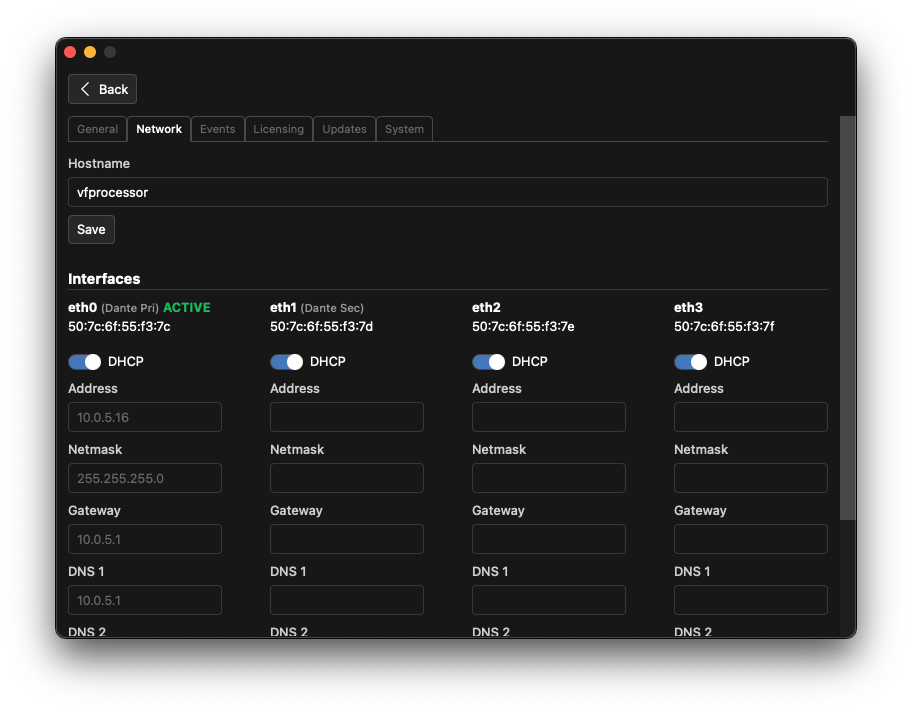 Click the Network tab to set the IP address of the available network interfaces on the processor. By default, the processor will attempt to use DHCP to obtain an IP address and will automatically revert to a zero-configuration address if no DHCP server is available. If a static IP address is needed, uncheck the DHCP box and enter the desired IP address, subnet mask, and gateway. Note, if using external control interfaces, the use of a static IP address or a DHCP reservation is recommended.